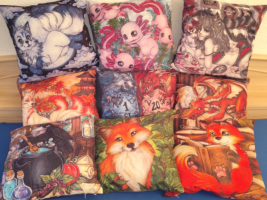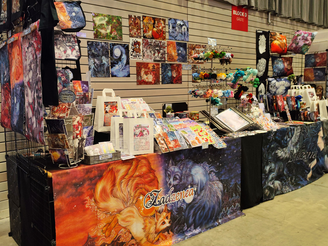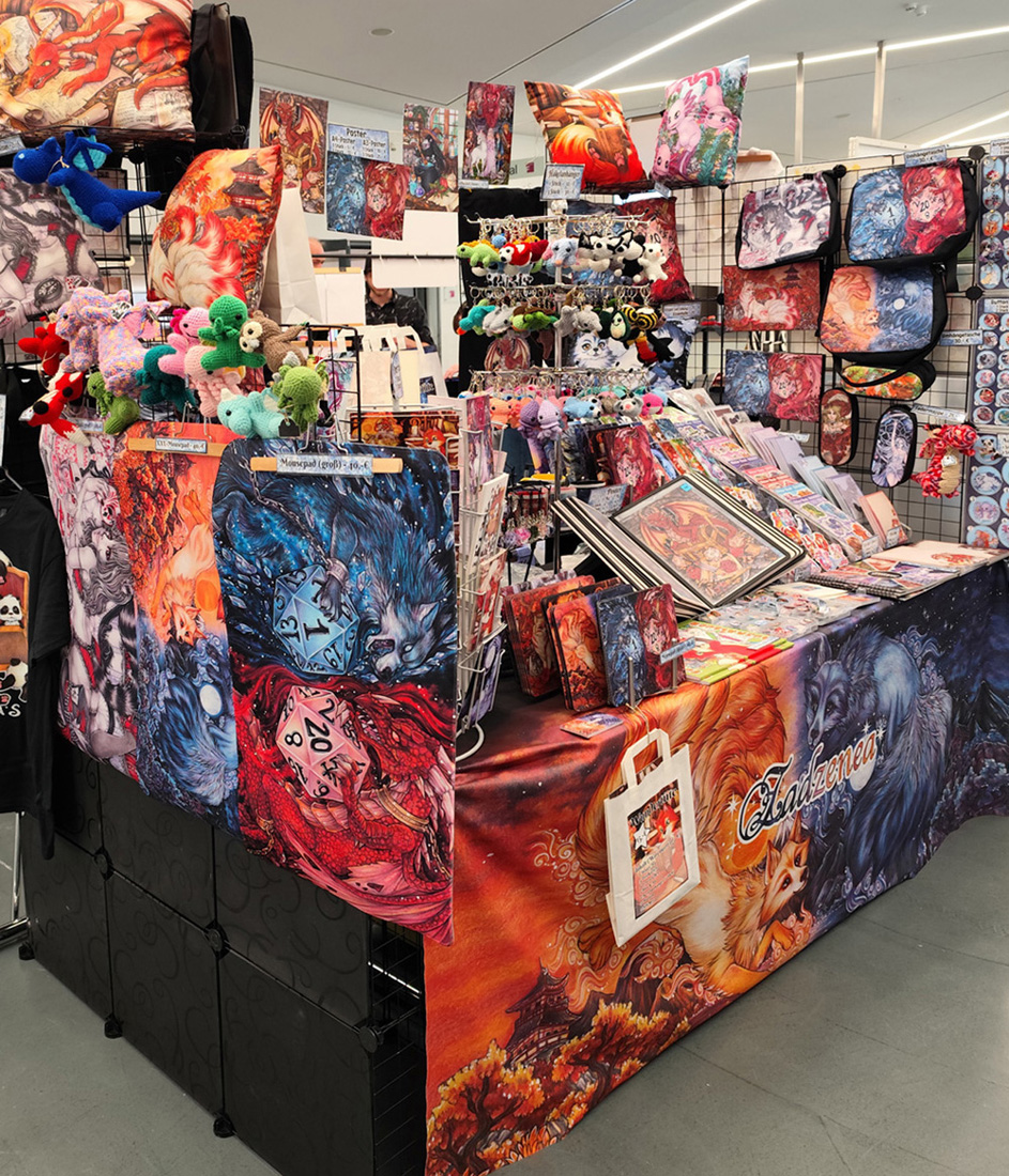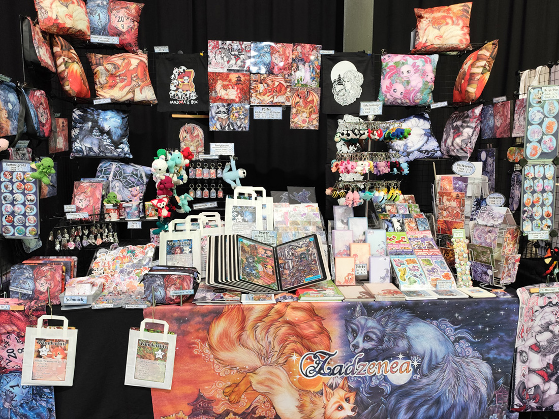 Neben diversem Merchandize zu ihren Bildern, z.B. Postern, Lesezeichen, Anhängern, Conhonbücher bishin zu Kissen, Taschen und Federmappen, bietet sie auch handgehäkelte Amigurumi-Tierchen an und zeichnet auf den Conventions auch live auf Wunsch.